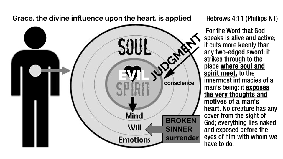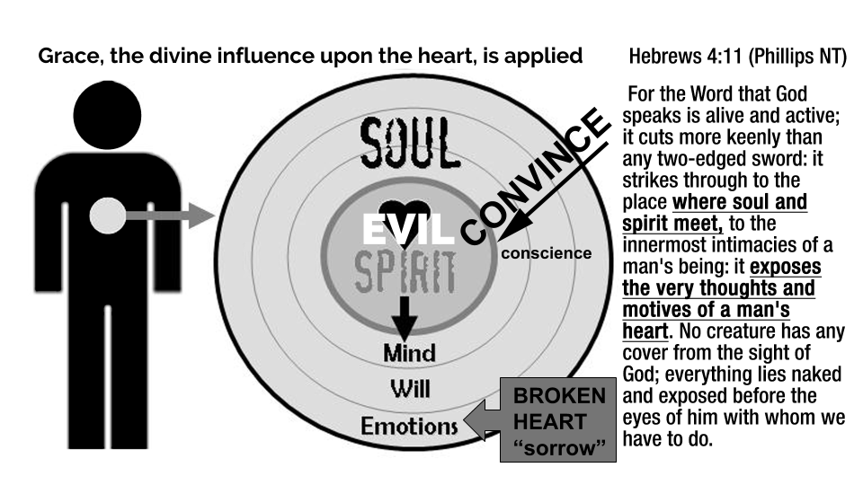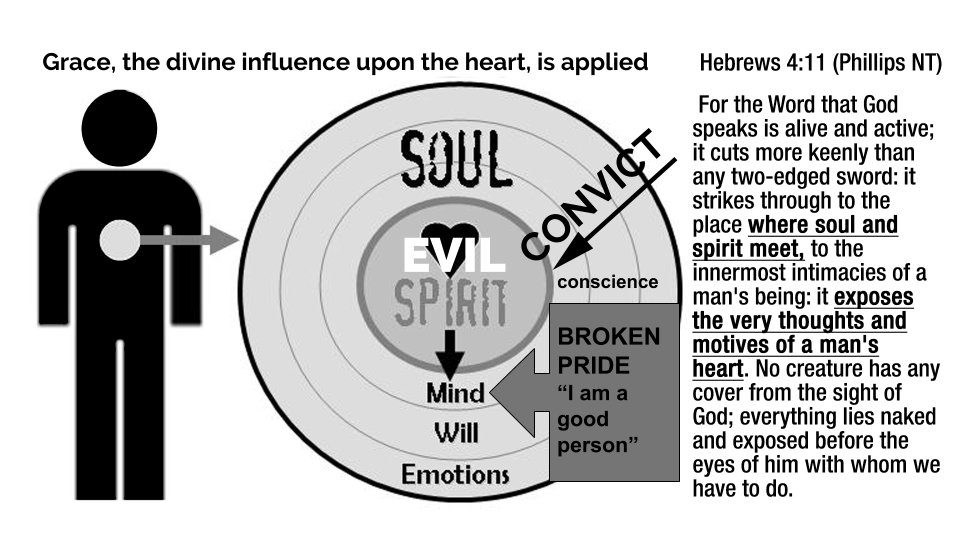 This unmerited grace of conviction is a free gift of God. With the power of the Holy Spirit (Acts 1:8) a Christian shares the gospel with someone and God thrusts the Law past their mind, will, and emotions and stabs the Word into the conscience, exposing “the very thoughts and motives of a man’s heart.”