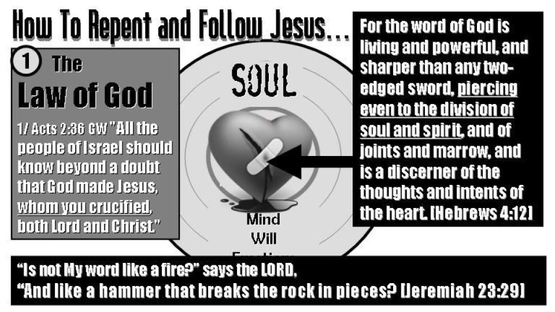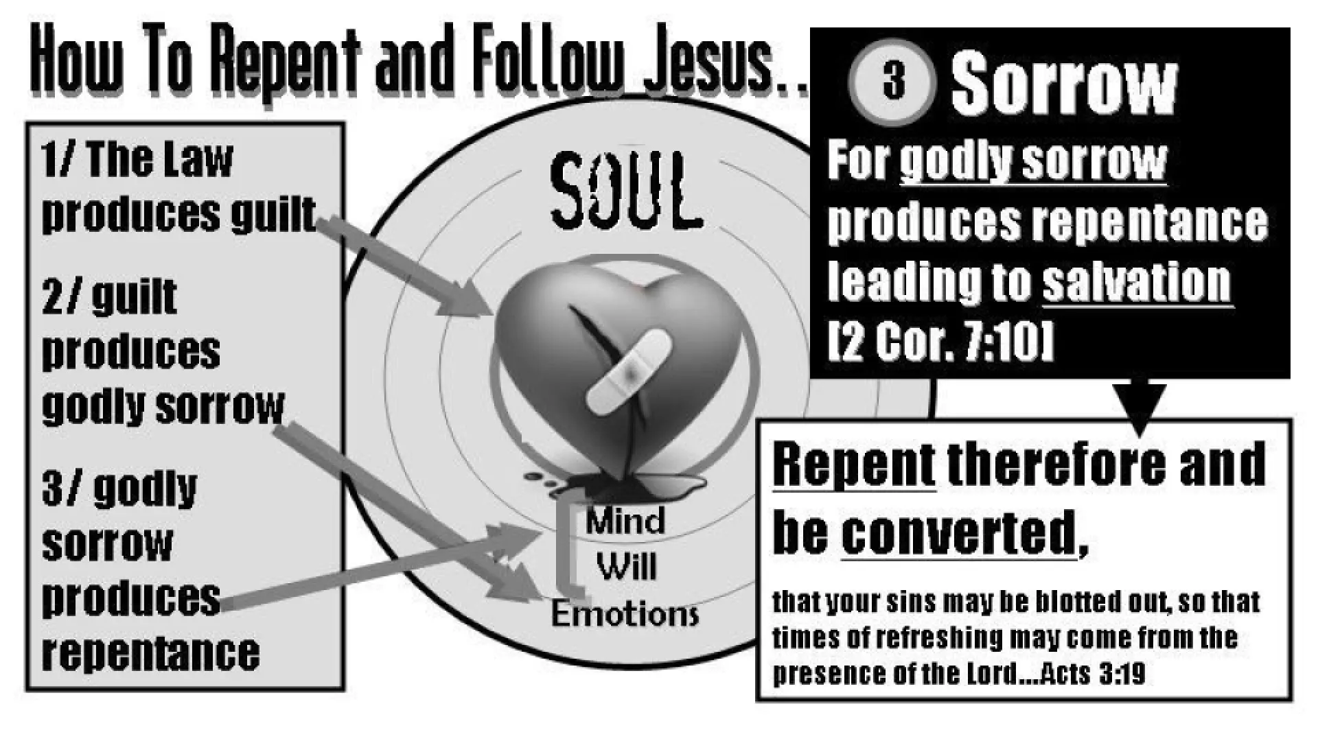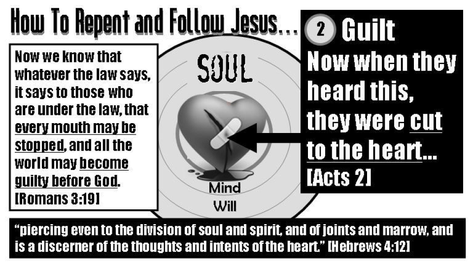 For the Holy Spirit to enter our spirit and give us a new heart the conscience must be pierced until we see our true sinful nature. We all must realize and confess our specific spiritual crimes like they did under Peter’s sermon. The Holy Spirit presses God’s Law upon the conscience until it produces guilt. To receive salvation our hard heart must be broken.