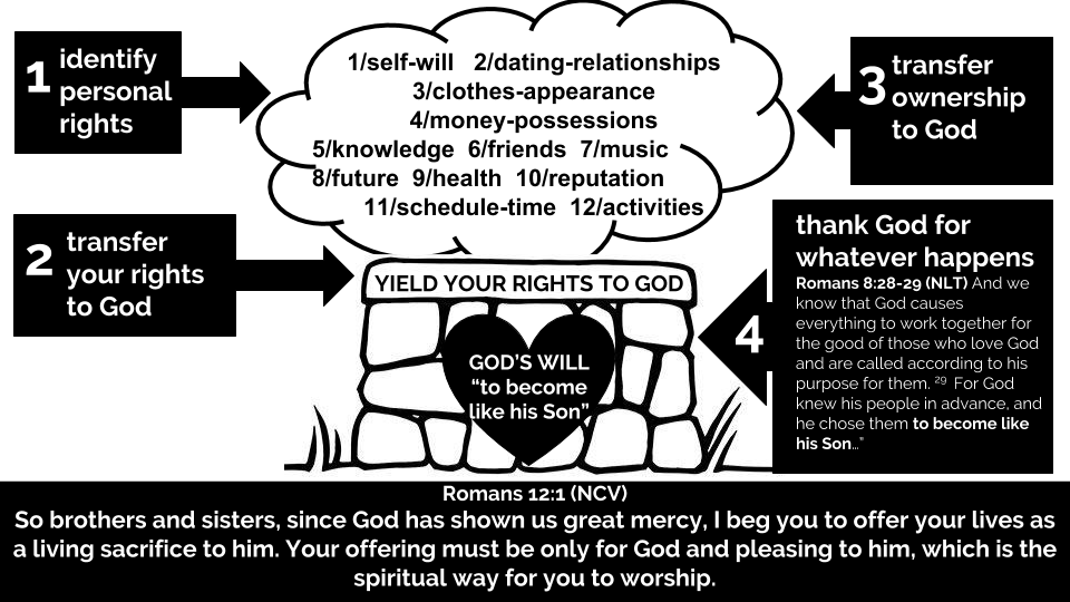 2/ Then surrender that right to God. For example, “I turn the right to spend my money any way I want over to God’s control.” Take responsibility to support your family, your church, and pray about how to spend your money. Read the Bible and follow the instructions of God. This is a whole new way of life.
